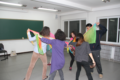 本次活动的目的在于借助舞动发掘潜在自己体内的真实自我,学习对自我的接纳与爱,释放自身的不良情绪,建立起持久的不断被滋养的自信,激发学生热爱生活、热爱生命的动力。活动的第一个环节是学生用肢体语言来打开自己,刚开始有些同学比较拘谨,随着老师的带领,同学们逐渐放松了,很快的投入了这次的活动。徐老师用“纱巾”舞动,绘画交流以及行为互动等方式带领大家将内心感受及对未来的希望祝福表现出来。活动结束后,参加活动的留学生纷纷表示,这样的活动很新奇,也很有意义。舞动的形式使自己在身体层面及心理层面都得到了释放,体验到了与他人的人际互动,增强了关爱自我和他人的能力,有利于自己在学校更好地学习和生活。