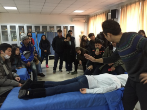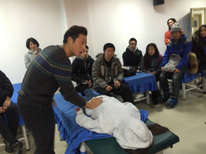 同学们首先来到针推实训室,针推学院的姚斌彬老师先给大家做了讲解,同学们带着好奇,勇敢地把自己贡献出来当“试验品”,姚老师现场给大家演示了推拿的不同手法,同学们边看边听,兴致勃勃,有些同学还迫不及待地用身边的同学练习起来。
