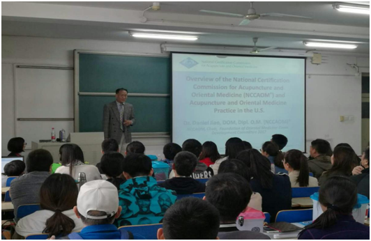 随后,国际学院邀请CNT主考官、美国全国针灸和东方医学鑑定委员会NCCAOM三届董事会主席、NCCAOM 中医专家委员会主席焦望义博士做了题为《美国中医师执业的形势及如何考取美国中医针灸师执照》的讲座。在讲座中,焦博士展望了美国中医师执业的良好前景,介绍了考取执照的经验方法,同时告诫学生们要全面认真地学习各门功课,要成就“中文好,英文好,中医好,西医好”的四好,方能立足美国这样的强强之林。最后,焦博士鼓励大家在追求自身发展的同时,要为推动中医在全球的发展而贡献力量。一百多名国际及中国师生到场聆听了这场“传道,授业,解惑”的讲座,现场反响热烈,讲座圆满成功。