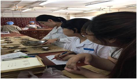 学生在药房认药、抓药                      学生跟诊