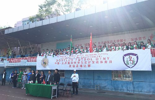 4月25日,我院2017级23名土库曼斯坦学生应邀参加了中国·土库曼斯坦学生友好交流足球比赛。比赛场地设在我校和平街校区操场,土库曼斯坦驻华大使馆大使Rustamova女士、北京中医药大学副校长翟双庆、国际交流与合作处处长唐民科、国际学院院长吴宇峰、副院长丁胜云出席了本次活动。此次足球赛是一次非常难得的外交体育交流活动,两队均加倍珍惜此次机会,比赛过程中你追我赶、激情四射、精彩纷呈,最终土库曼斯坦留学生联队取得了胜利。此次比赛充分展现了中土学生奋发进取的精神,鼓舞了斗志,也加深了友谊。