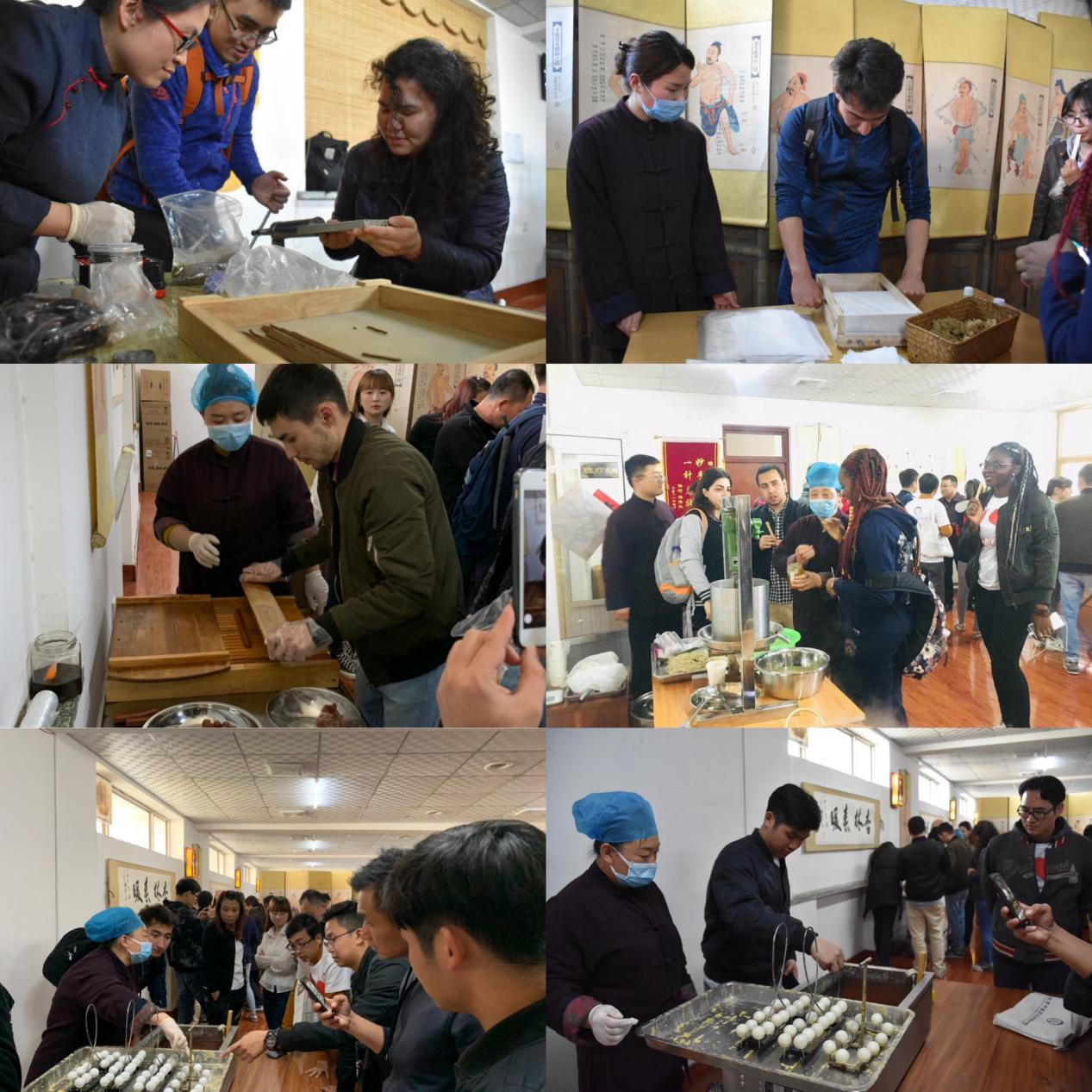 “草到安国方成药,药经祁州始生香”。在带队专家讲解下,同学们首先参观了药王庙,了解安国药市的起源,感受悠久的中医药历史与深厚传统文化底蕴。下午,同学们来到安国数字新药都,了解到“互联网+”背景下的数字新药都建设情况及功能设置,领略到对中药产业发展的政策支持及新时代绘就的产业发展宏伟蓝图。随后,同学们前往药都国医馆,学习了制作大山楂丸、卷艾条、熬制饴糖、做药香、手工吊蜡等培训课程。此外,同学们还参观了九蒸九晒生产区,边听专家介绍,边观察、品尝各个蒸煮炮制阶段的地黄、黄精等,细细体会不同蒸晒批次间的口感变化,感受到古法炮制工艺之精细和继承传统之不易。